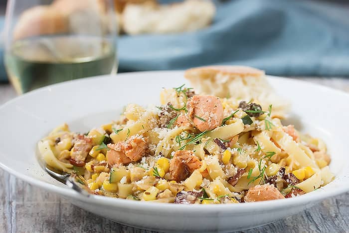 A salmon pasta dish that tastes just like seafood chowder. It’s warm, comforting, thick and creamy with tons of chunks of veggies and seafood!